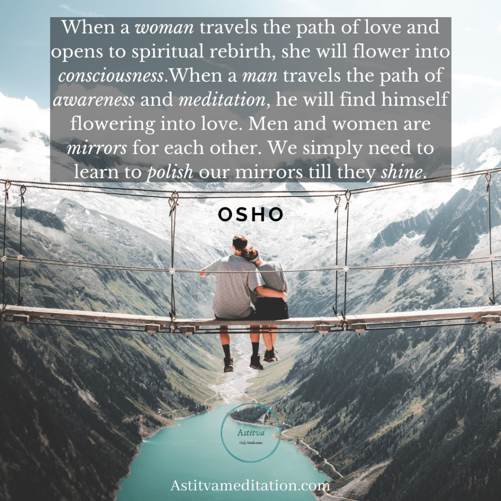 When a woman travels the path of love and opens to spiritual rebirth, she will flower into consciousness. When a man travels the path of awareness and meditation, he will find himself flowering into love. Men and women are mirrors for each other. We simply need to learn to polish our mirrors till they shine.