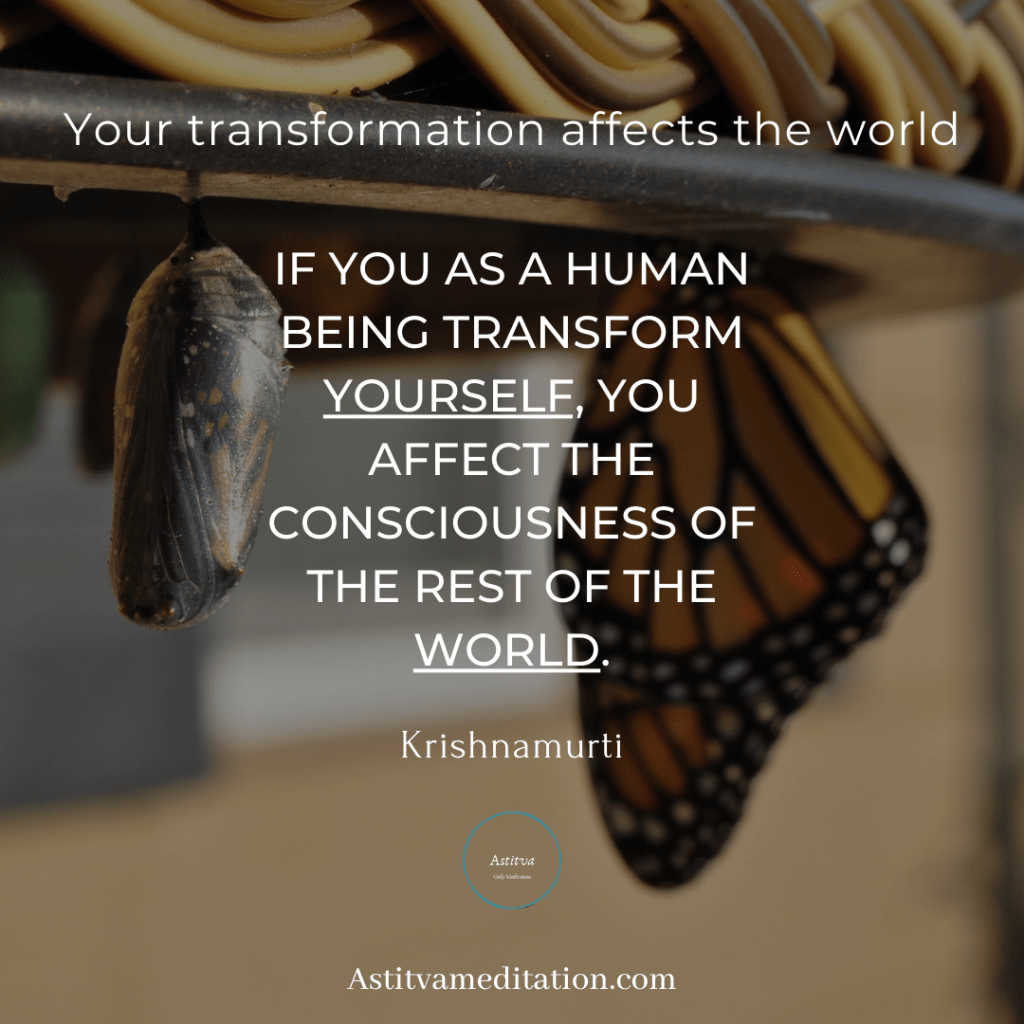 by Astitva Well Being Posted on November 30, 2020December 7, 2020 Image Transform Yourself ~ Krishnamurti If you as a human being transform yourself, you affect the consciousness of the rest of the world.Krishnamurti Share this: Click to share on X (Opens in new window) X Click to share on Facebook (Opens in new window) Facebook Like Loading... Related