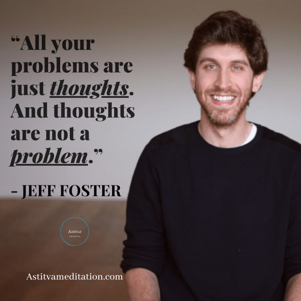 by Astitva Well Being Posted on December 1, 2020December 7, 2020 Image Problems are just thoughts ~ Jeff Foster “All your problems are just thoughts. And thoughts are not a problem.”– Jeff Foster Share this: Click to share on X (Opens in new window) X Click to share on Facebook (Opens in new window) Facebook Like Loading... Related