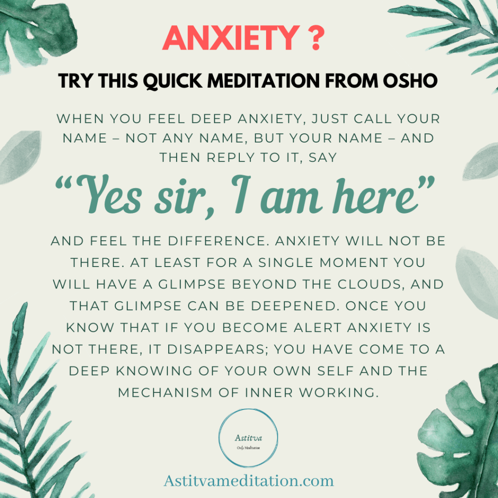When you feel deep anxiety, just call you name – not any name, but your name – and then reply to it, say “Yes sir, I am here“ and feel the difference. Anxiety will not be there. Atleast for a single moment you have a glimpse beyond the clouds, and that glimpse can be deepened. once your know that if you become alert anxiety is not there, It disappears; you have come to a deep knowing of your own self and the mechanism of inner working.