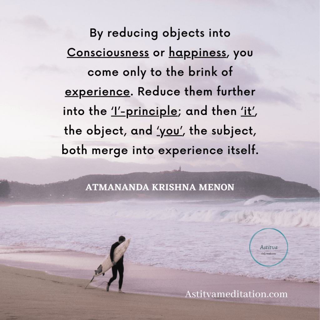 By reducing objects into Consciousness or happiness, you come only to the brink of experience. Reduce them further into the ‘I’-principle; and then ‘it’, the object, and ‘you’, the subject, both merge into experience itself.
